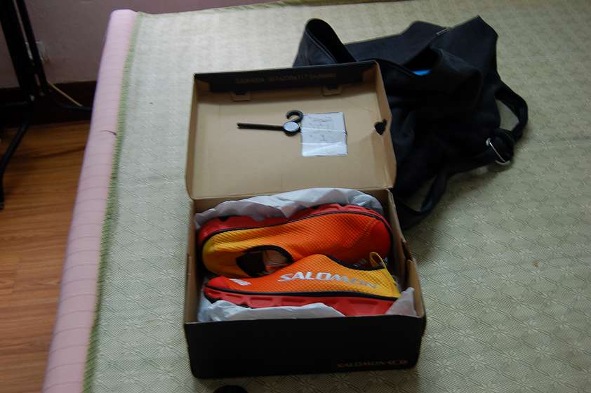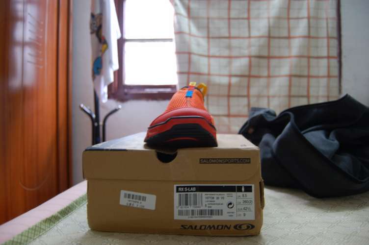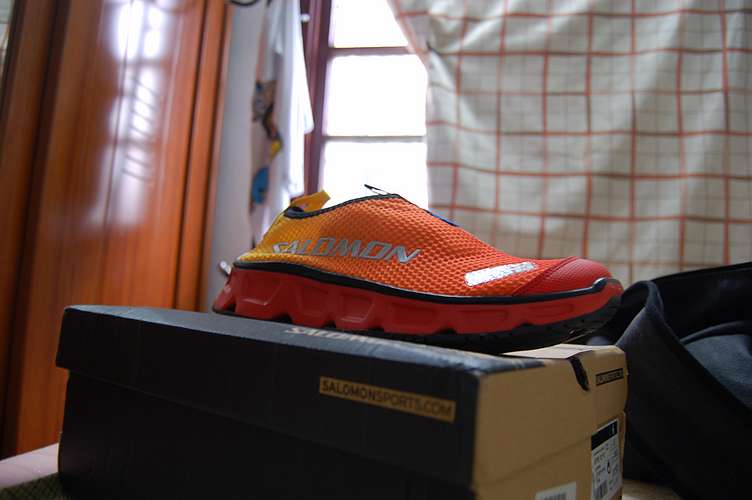 salomon rx s-lab 恢复鞋,入手了入手了入手了~~~颜色有点骚啊.上面那根杆子是给你来挂鞋的,我拿来挂其他鞋了- - 脚丑.别看 好吧我拿来挂creation10了